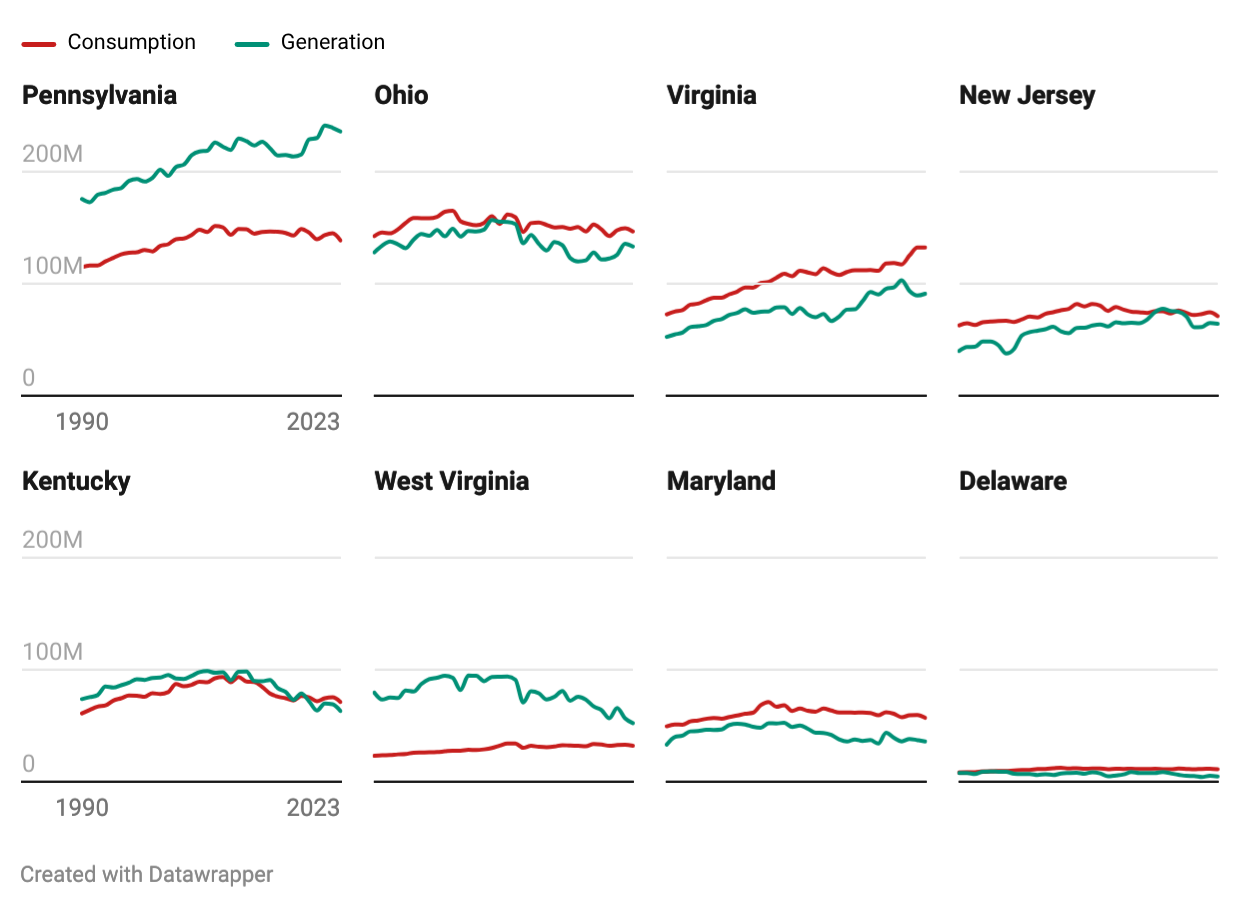 However, almost all of the surplus electricity comes from Pennsylvania, which generated more than one third of the region’s combined generation in 2023. West Virginia was the only other state with a surplus of electricity generation. Ohio, New Jersey, and Kentucky consumption and generation were almost equal in 2023, while Virginia, Maryland, and Delaware consumed more electricity than they generated. Virginia in particular has seen electricity consumption rise in recent years, in large part due to data center expansion.